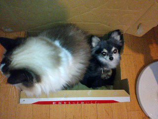 ![]() 今日は、温かい日でしたが私は朝からえらい目に遭いました(笑)チャッピー君に返し忘れた緑と黒のボーダー柄のTシャツを裏玄関にあるシンクの淵に置いておいたのですがちょっと探し物をするのにそのTシャツに手をかけた瞬間ズッキーンと左手の手のひらに痛みを感じました。余りの痛さに外へ出てうずくまり、右手で左手を押さえてしばらくじっとしていました。その間何か神経の病気で手の末端にこのように痛みを感じるのだろうかととても心配になりました。突然の痛みとその痛みの種類がどこから来ているものなのか全く見当がつかず指先は痺れて来て熱を帯びて来てこれは、おかしい何かの病気かも知れないとうずくまりながら真剣に考えておりました。そうしてほんの少し痛みが和らいだとき我に返り、この痛みは何だか鋭いし何かに刺されたのではないかと考える余裕が出てきました。裏玄関に戻り辺りを見回してみると、やはりいました。窓に止まっている蜂が。。。中くらい?のボーダー(笑)柄の蜂で多分ボーダー柄のTシャツに止まっていたのでしょう。それに気づかずその上に手を載せてしまい刺されたのだと思います。。本当に痛く、キンカンを塗ったのですが、今もまだ痛いです。ずっと注射針を刺した瞬間が続いているような感じで手のひらの刺さりどころ(笑)が悪かったのでしょう。体調に変化はなくすこぶる元気ですので大丈夫そうですが本当に参りました。前置きが長くなりすみません。家のチワワのコソットちゃん、あだ名はコッチャンは最近寒くなり暖かい場所を探してはそこで眠っています。時には窓から差す陽だまりにいたり猫にくっついて眠ったりしています。買い物の時に持って帰ってきた段ボールを何気なく床に置いたら早速ラグドールのほーたんがその中に入りすかさずコッチャンが横にいますコッチャンは、いつも小さな頭で色々と考えていて世渡り上手のこずるい子です。時々猫の遊び相手のネズミ代わりになっているコッチャン。ほーたんは温かく、優しくて良かったね。